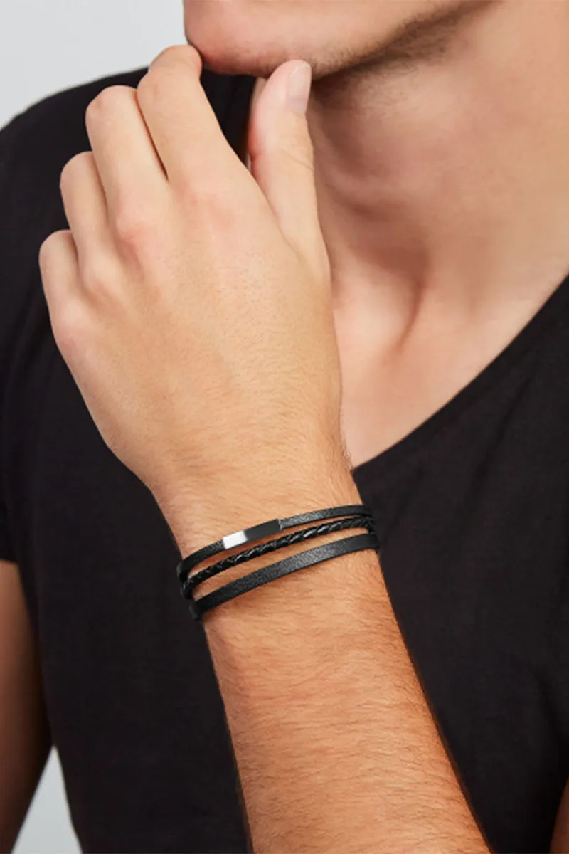 Fossil muška narukvica od crne kože i nerđajućeg čelika. Dimenzije: 205 x 20.2mm.